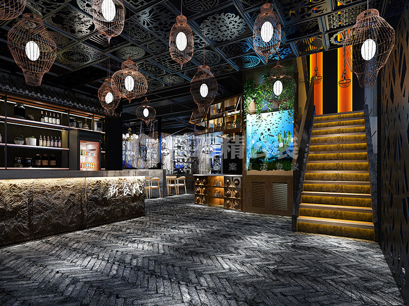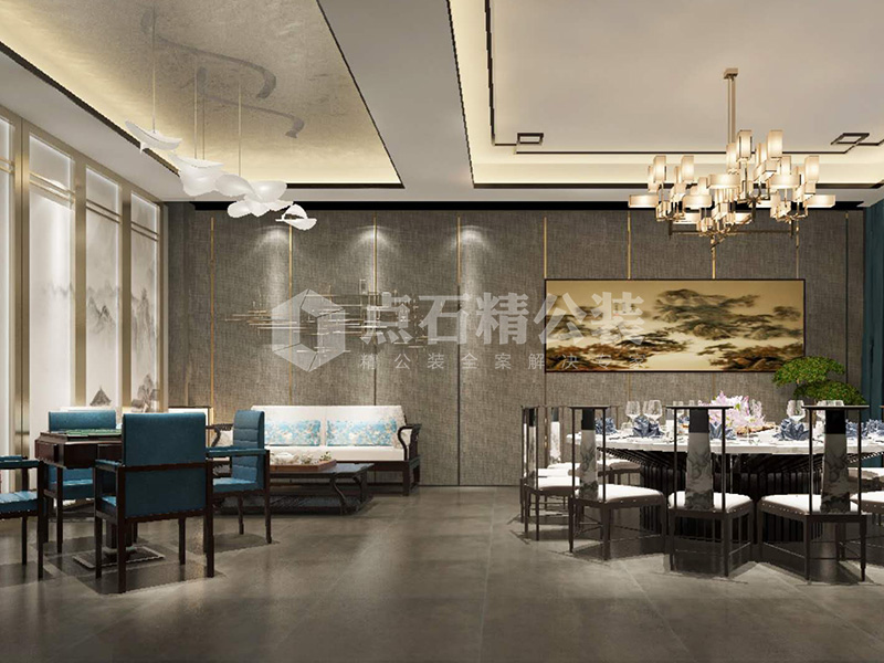 本案采用饰面板、青石瓦、仿古砖、不锈钢隔断、铁艺雕花、硬包,钛金线条等材质,风格以徽派+现代风格为主。