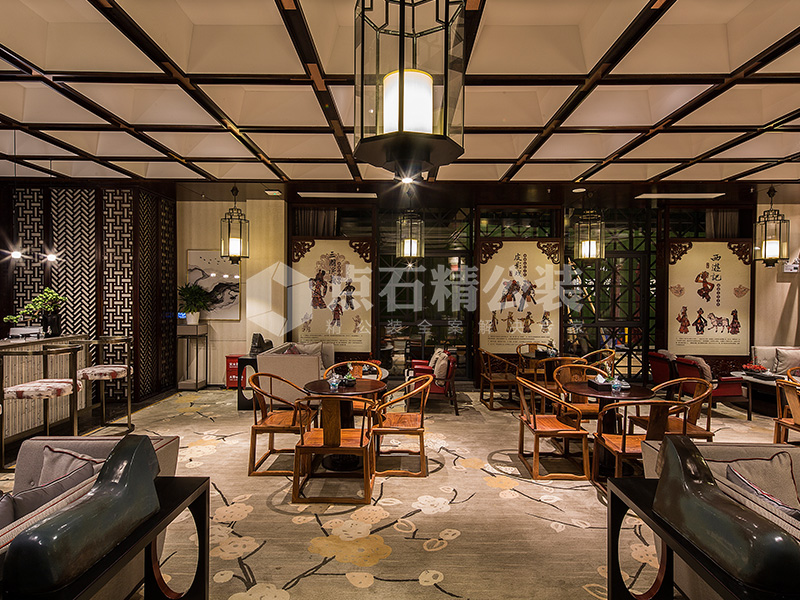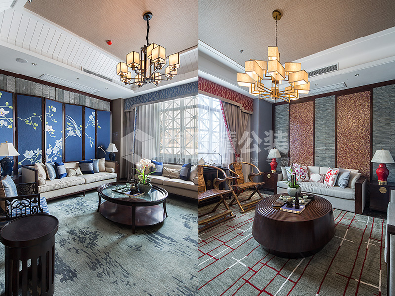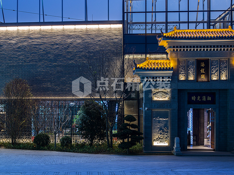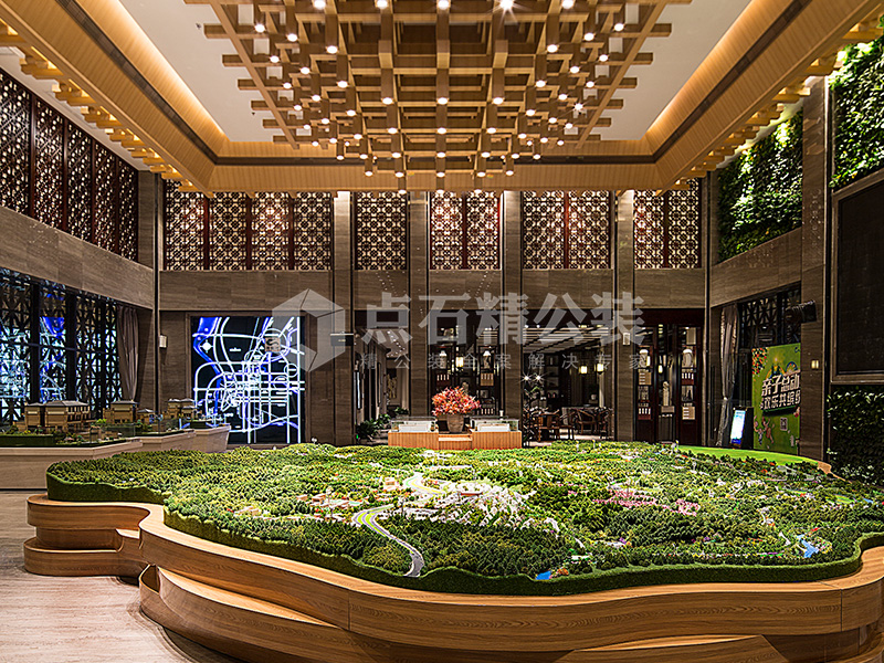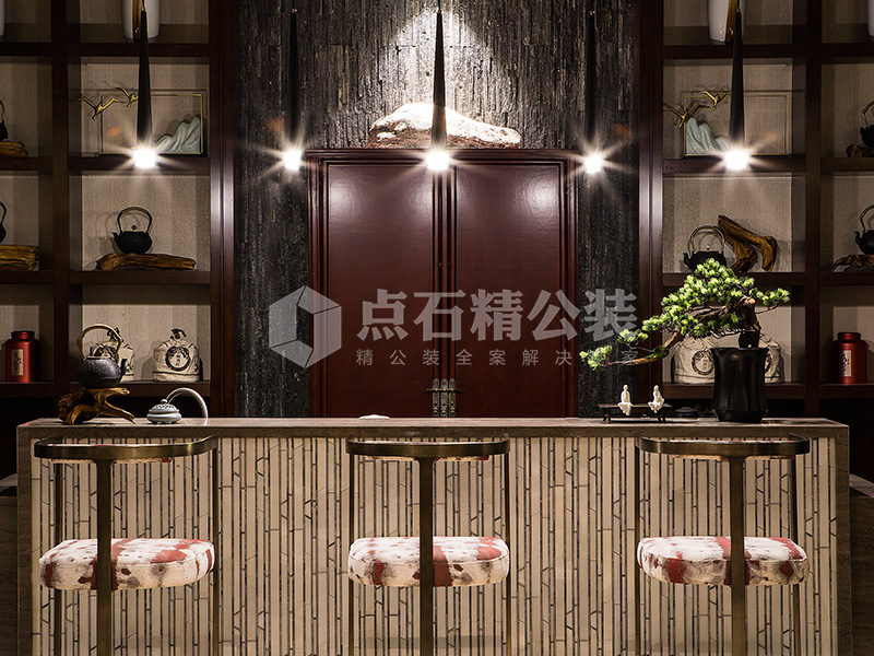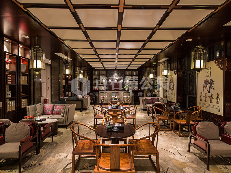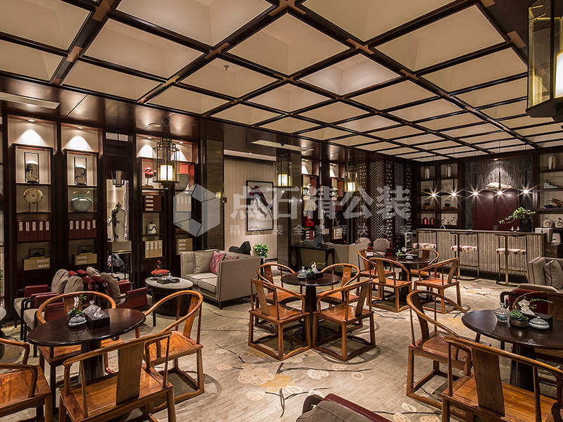 说明:本案为湖南长沙浔龙河时光潇湘售楼中心,主要风格为中式风格,大量采用中式元素如实木桌椅、博古架、花瓶瓷器等,整个空间古朴典雅,包含了十分丰富的文化意蕴。