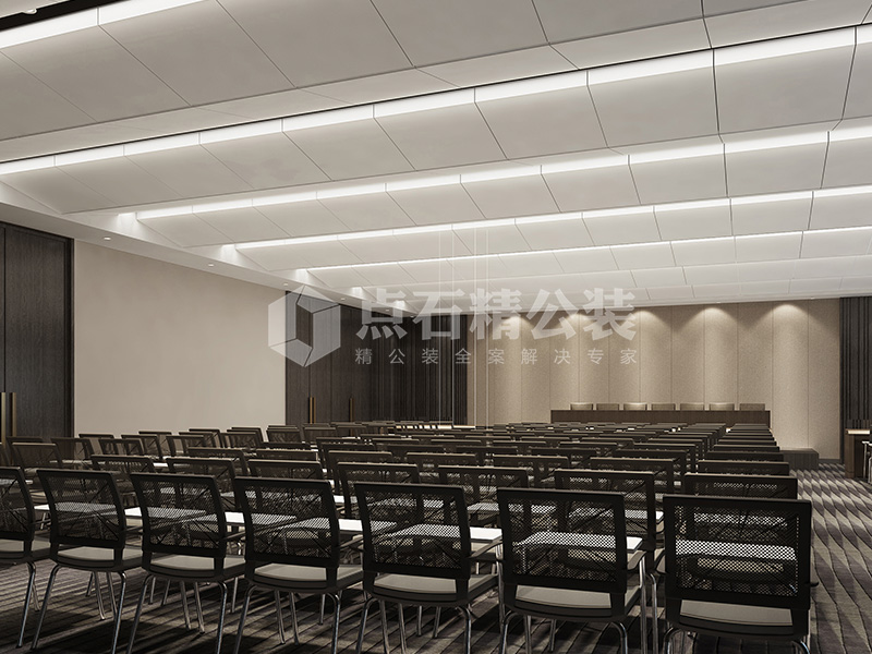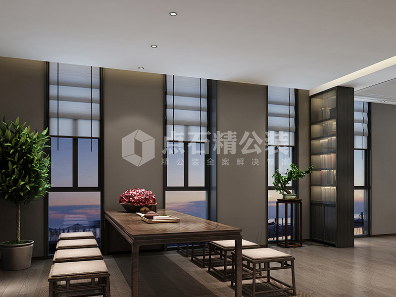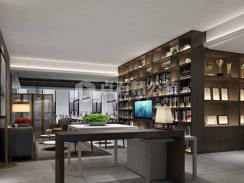 说明:本案设计以新中式风格为主,前厅、休息区、公共办公区、贵宾接待室、办公室、培训师等空间内色调和谐统一,山水画、瓷器、古典书架、绿植等装饰偶尔加以点缀,使得空间更加轻松自然。